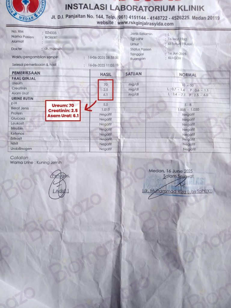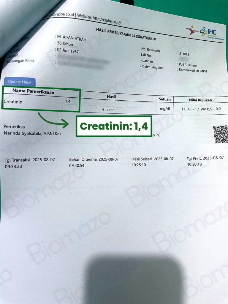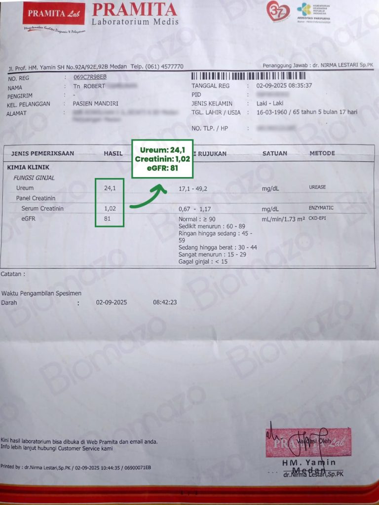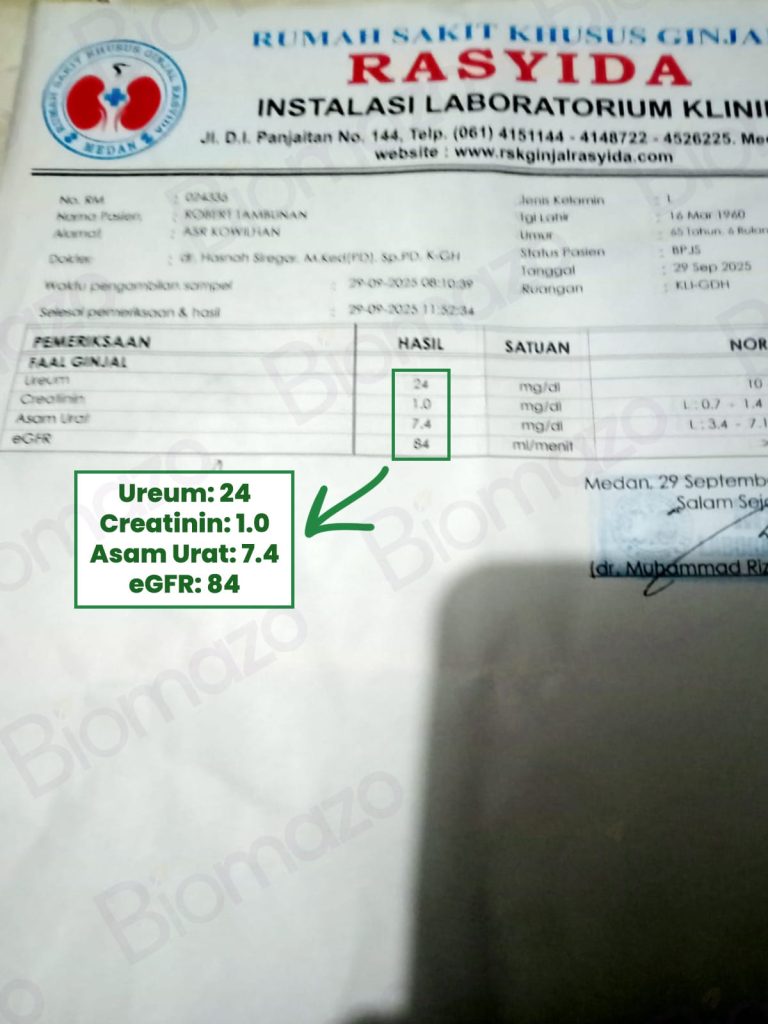 11 Juni 2025, saya cek lab alhamdulillah kreatinin turun drastis jadi 3 dan ureum 60. Saya sangat senang dengan hasilnya jadi tidak perlu cuci darah. Saya teruskan minum Biomazo & Neomorica